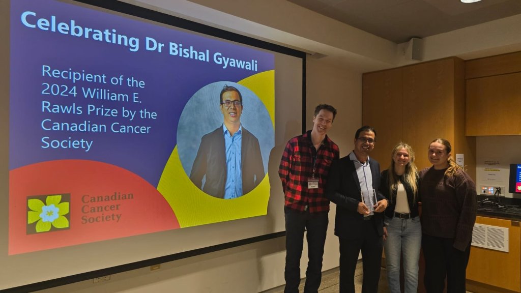 - Queen’s Sinclair Cancer Research Institute hosted a celebration recognizing Dr. Gyawali’s Award for Excellence in Cancer Research. At the ceremony, Dr. Gyawali delivered a talk, From Kathmandu to Kingston: My Journey of Cancer Policy Research, sharing his academic journey and research career milestones – read more here!