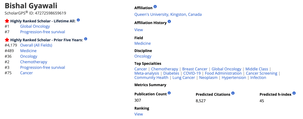 ScholarGPS recognized Dr. Gyawali as a Highly Ranked Scholar in the specialties of Global Oncology and Progression-Free Survival.